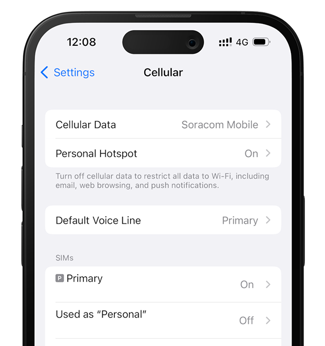 Go to Settings > Mobile Data and tap on Cellular Data, and select Soracom Mobile eSIM. If it's not displayed as an option, enable 'Turn On This Line' under SIM section.