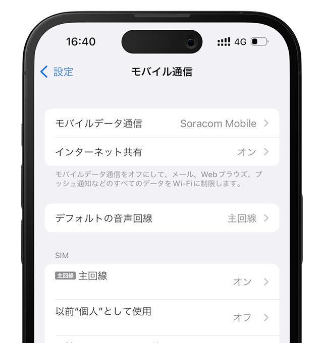 設定 > モバイル通信 > モバイルデータ通信をタップし、ソラコムモバイルのeSIMを割り当てます。尚、選択肢として表示されない場合は、SIMのセクションで該当回線を選択し、「この回線をオンにする」を有効にしてください。